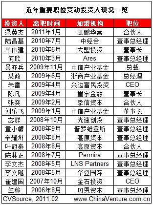国内VC/PE行业的中高层投资人职位变动在2009年前后进入活跃期。ChinaVenture投中集团分析认为,随着中外资机构之间、成熟基金与新募基金之间的竞争日益加剧,未来1-2年内,中高层投资人的离职现象将更加普遍,独立募集或加入新基金、转投成熟基金将成为其主要的职业发展选择,GP与LP因此可能遇到的风险亦需受到重视。