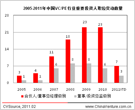图2 2005-2011年中国VC/PE行业重要投资人职位变动数量