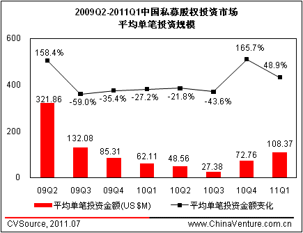 图2 2009Q2-2011Q1年中国私募股权投资市场季度平均单笔投资规模