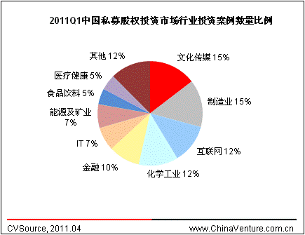 图3 2011Q1中国私募股权投资市场行业投资案例数量比例