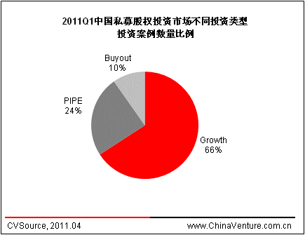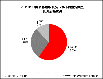 以2011年第一季度PE投资类型来看,披露成长型(Growth)投资案例42起、PIPE投资16起、Buyout类型投资6起,分别占比65.6%、25.0%和9.5%;投资金额方面,三种投资类型占比分别为59.6%、28.1%和12.2%。