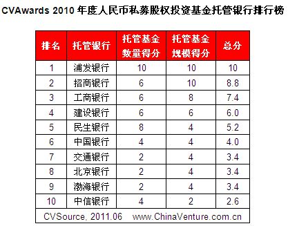 ChinaVenture投中集团推出“CVAwards 2010年度人民币私募股权投资基金托管银行排行榜”,该榜单以托管基金数量及规模为主要评选条件,最终得出排名前10名的托管银行,其中,上海浦东、招商银行和中国工商银行名列三甲。