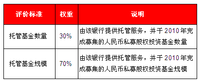 本次评选入围标准为总部位于中国大陆的商业银行,并具备产业投资基金托管业务资格。依据ChinaVenture 投中集团旗下数据库产品CVSource掌握数据及VC/PE投资机构调研数据,对入围商业银行2010年托管的人民币私募股权投资基金数量、募资完成规模两项指标进行评分,各项指标得分及总分均为10分制。
