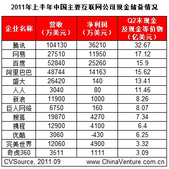 表1 2011年上半年中国主要互联网公司现金储备情况