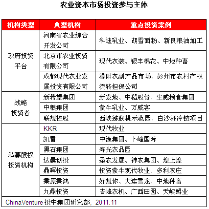 产业资本的典型如新希望集团及中粮集团,在“全产业链”思路下,近年来进行了大量的投资及并购,并分别成立产业投资基金,成为了农业领域活跃的战略投资者。而其他产业巨头也相继“跨界”发力农业产业投资,2011年10月,联想集团新兴市场总裁陈绍鹏加入联想控股,领导其旗下新的核心新业务——现代农业,意味着联想控股对大农业的布局步伐正在加快。此外,汇源的朱新礼、万达的王健林、网易的丁磊等不同领域的行业巨头也均布局农业产业,显示出农业产业投资的巨大吸引力。