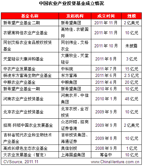 近期,规模2亿美元的新希望二期基金正式宣告成立,为目前日趋活跃的农业产业投资再添一支新生力量。早在2010年,以饲料起家的新希望集团就成立了总规模为30亿元的涉农产业基金,并在年底向北京新发地农产品市场注资1.06个亿。目前,成立产业投资基金已成为战略投资者以及私募股权投资机构参与农业投资的主流方式,除了农业产业投资价值的凸显,政策层面也频频释放积极信号:2009年“一号文件”首次指出有条件的地方可成立政策性农业投资公司和农业产业发展基金,而2010年的“一号文件”则明确指出要建立农业产业发展基金。