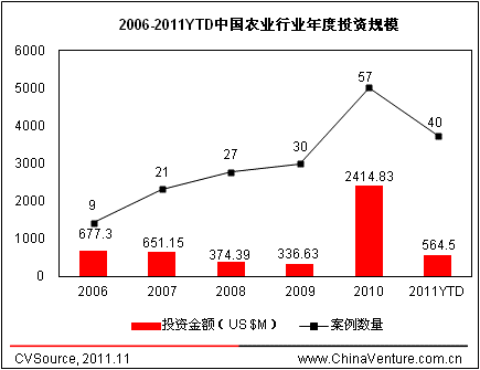 根据ChinaVenture投中集团旗下金融数据产品CVSource统计,2006年至2011年第三季度中国农业行业共披露184起VC/PE投资案例,投资总额达到50.19亿美元。其中,2010年出现“井喷”式增长,披露57起案例,投资24.15亿美元,投资数量及规模均达历史最高水平;2011年至今已披露40起案例,投资总额达5.64亿美元。