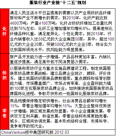 作为纺织行业的子行业,服装行业与家纺行业在整个行业中占有主导地位,从产业链的角度来讲,化纤、纺织、零售行业相继发布“十二五”规划,对整个产业链的各分行业,尤其是处于中游的服装行业受益颇丰(见图1,表1)。