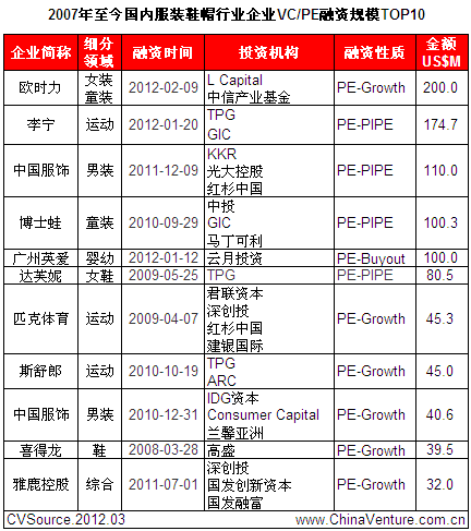 表2 2007年至今国内服装鞋帽行业企业VC/PE融资案例TOP10