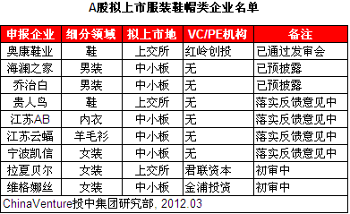 此外,ChinaVenture投中集团根据证监会公布的首次公开股票申报企业名单进行整理发现,截至3月8日,国内共有9家服装类企业拟登陆A股资本市场,其中3家有VC/PE背景,君联资本、金浦投资、红岭创投有望退出(见表2)。