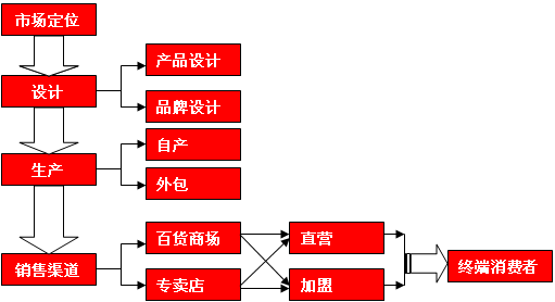 服装产品通过市场定位、设计、生产、销售渠道四个环节,最后到达终端消费者。在准确市场定位后,产品与品牌的设计,往往成为一家公司的软实力,渠道结构及管理能力则可以成为其盈利的决定因素(见图2)。具有百年传承的世界顶尖服饰品牌,往往拥有国际一流的设计团队、引领时尚的设计理念、几十年甚至上百年的家族式手工艺传承,给消费者带来的不仅是独特的产品,更多的是品牌在精神层面的价值及文化传承。最近几年,国内企业也开始增加产品和品牌设计的投入,着手高薪聘请国际优秀设计师,以扭转国内以ODM和模仿大牌为主,款式陈旧同质的竞争现状。