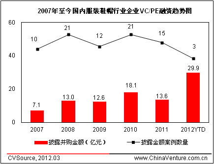 图3 2007年至今国内服装鞋帽行业企业VC/PE融资趋势图