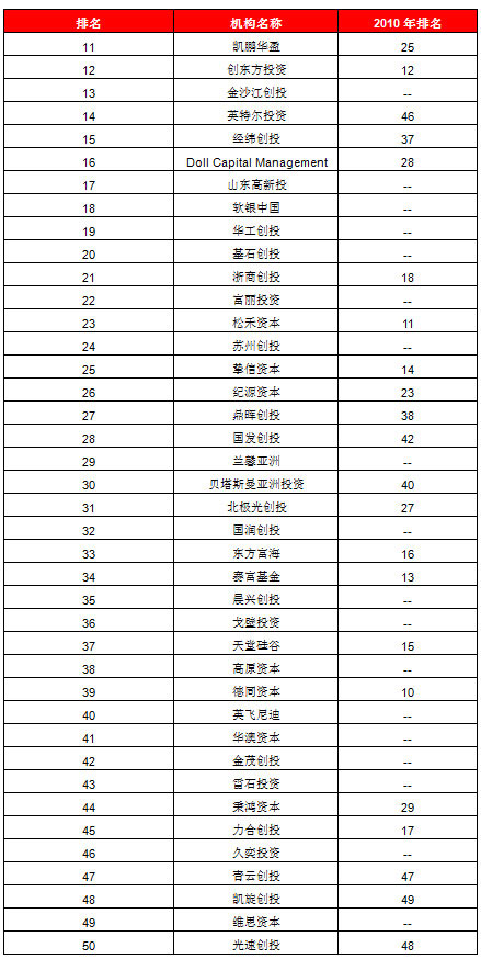 在2011年度中国最佳创投(VC)机构TOP50榜单中,深创投继续保持领先优势,披露投资案例80多起、退出案例近10起,均高于其他机构,不过相比2010年,其退出数量有所下降,显示出2011年资本市场低迷引发的IPO退出渠道收窄状态。达晨创投投资数量也达到50起以上,在退出及募资方面也表现优秀,并从上届榜单的第六名升至第二名。排名第三的君联资本,于2011年各完成人民币基金及美元基金募集,募资总额超过10亿美元,并因此获得“CVAwards 2011年度中国最佳募资创业投资机构”奖项。