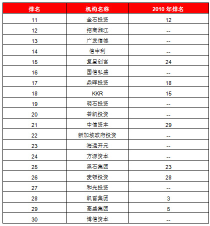 从上榜机构属性来看,本土机构在榜单占比有所增长,TOP10中人民币基金管理机构达到6家,而整个TOP30榜单中,本土机构达到15家左右。与整个VC/PE市场人民币基金占主流的趋势相一致,多数外资机构已经募资成立人民币基金,比如新天域资本、弘毅投资、鼎晖投资等,而一些国际PE巨头,如黑石、凯雷等,也于2010-2011年间在中国设立人民币基金。