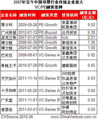 表3 2007年至今中国母婴行业传统企业重大VC/PE融资案例