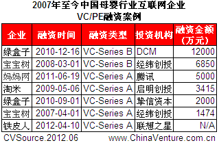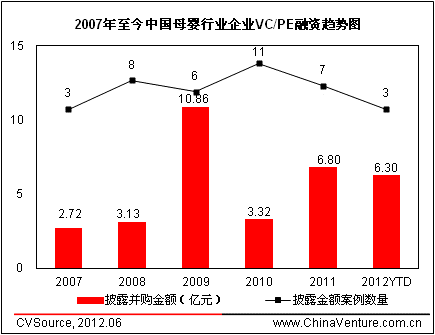 根据ChinaVenture投中集团旗下金融数据产品CVSource统计显示,2007年至今中国母婴行业共有38笔VC/PE融资案例发生,涉及24家企业,累计披露融资规模达33.12亿元。