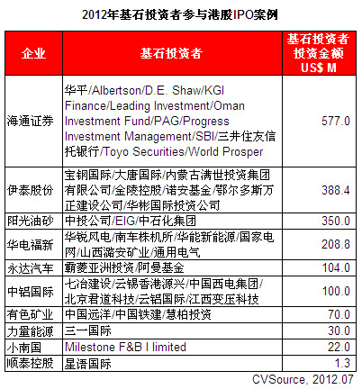 表1 2012年基石投资者参与港股IPO案例