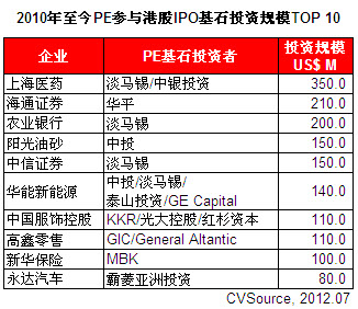 表2 2010年至今PE参与港股IPO基石投资规模TOP10