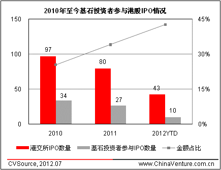 近年来,基石投资者在港股IPO中的活跃度不断提高,根据ChinaVenture投中集团旗下数据产品CVSource统计显示,2010-2011年间,具有基石投资者的IPO数量占所有港交所IPO数量的35%左右,基石投资者认购金额占比逐年上升。截至7月13日,今年共有43家企业在港交所实现上市,其中10家引入基石投资者,总认购金额达到18.5亿美元,占此10家企业总融资金额的43%。(见图1、表1)。