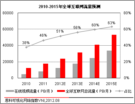 随着互联网、移动互联网的普及,全球在线视频行业步入高速发展期。根据思科可视化网络指数VNI(Visual Network Index)调查显示,2005年,在线视频流量仅占全球互联网总流量的5%,而2011年这一比例已上升到46%。在用户需求与技术推动之下,预计未来五年在线视频市场将保持稳定增长态势,到2015年,在线视频流量在全球互联网总流量中的占比将进一步提升至63%(见图1)。