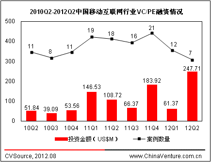图1 2010Q2-2012Q2中国移动互联网行业VC/PE融资情况
