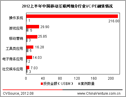 从2012年上半年的投资案例来看,游戏类应用投资最为活跃,如中国手机游戏门户和互动社区当乐网,获得赛富基金、启明创投、磐谷创投2000万美元联合投资,仅次于小米公司2.16亿美元融资规模。由于移动互联网游戏有着较为稳定的用户群体、收费模式也相对成熟,成为投资者持续关注的细分行业。