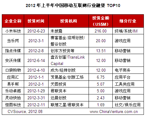 图2 2012年上半年中国移动互联网行业融资TOP10