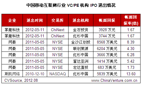 上述三家上市公司均有VC/PE机构支持,涉及账面退出8起。其中,账面回报率最高的为红杉中国在斯凯网络IPO中的退出,达13.6倍;网秦IPO中涉及5起退出,平均账面回报率5.2倍;掌趣科技涉及2起退出的账面回报率为1.67倍。由此也可以看出,随着境内外资本市场逐渐降温,移动互联网行业退出回报率也相应下滑。