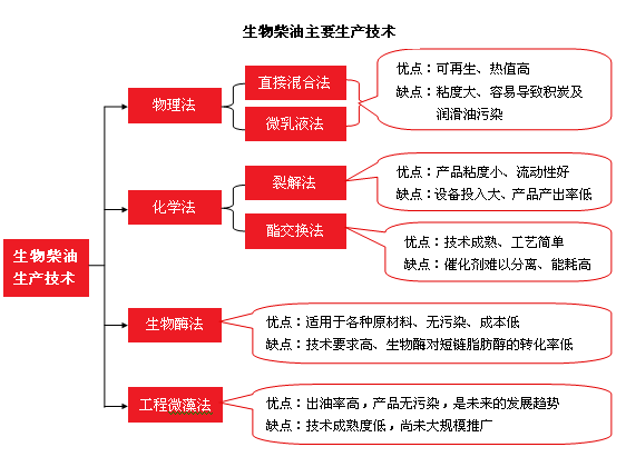 生物柴油的生产方法主要有物理法、化学法、生物酶法、工程微藻法等,各种生产方法的优缺点见图1-5。