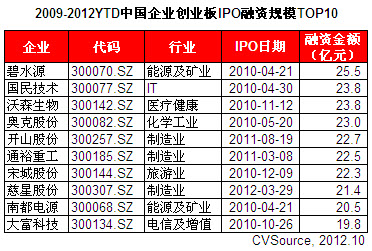 表1 2009-2012YTD中国企业创业板IPO融资规模TOP10