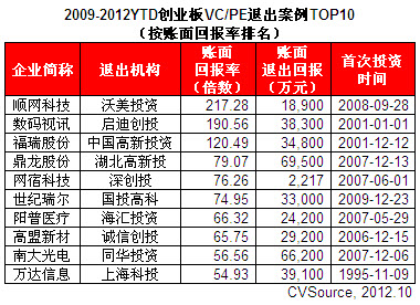 表2 2009-2012YTD创业板VC/PE退出案例TOP10(按账面回报率排名)