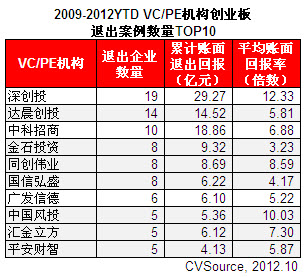 表3 2009-2012YTD VC/PE机构创业板退出案例数量TOP10
