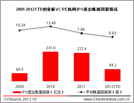 根据ChinaVenture投中集团旗下金融数据产品CVSource统计,创业板开板三年以来,共有355家中国企业在深交所创业板实现上市,总计融资达2295亿元。2009年至今,共有248家VC/PE机构通过355家企业在创业板上市实现462笔IPO退出,总计获得账面退出回报608.2亿元,平均账面回报率为9.16倍。