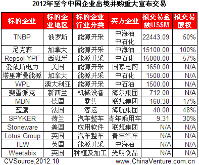 今年国内重大出境并购宣布交易中,能源行业和机械制造业无疑是一个亮点。首先能源方面,今年6月,中石化和中海油拟140亿英镑收购英国石油公司(BP)持有的俄罗斯第三大石油开发商俄罗斯能源合资公司秋明BP(TNK-BP)的半数股权;7月24日,中石化宣布已同意斥资15亿美元收购加拿大塔里斯曼能源英国分公司49%权益,逐渐展现出国内能源公司在走出国门展开收购的同时,不再满足于某一区域的能源开采权,而是转向对公司整体收购的趋势。