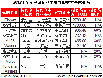 8月9日,国内汽车零部件制造商万向集团向美国最大的电池制造商A123系统公司(AONE.NSDQ)提出收购协议,拟以4.65亿美元收购其80%股份,在美国奥巴马政府大力扶持新能源的政策背景下,A123集团曾在2009年获得政府2.49亿美元资金注入。10月16日,A123公司宣告破产并终止与万向集团收购事宜,同时与美国江森自控集团达成1.25亿美元资产收购协议。交易的终止体现出美国对国有资产的保护,另外对市场份额和技术居行业第一的A123来讲,不愿核心技术流出是其主要想法。10月22日,美国豪客比奇宣布北京卓越航空拟114亿收购其资产的交易终止,卓越航空同时损失5000万美元保证金,缺乏资金实力成为本次交易失败的主要原因(见表3)。