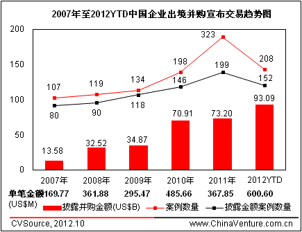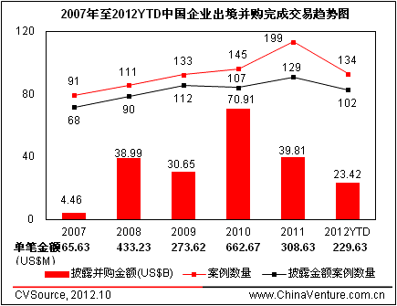 图3 2007年至2012YTD中国企业出境并购完成交易趋势图