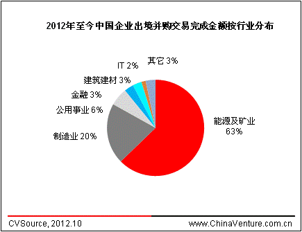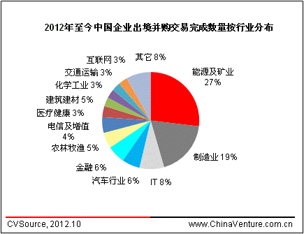 2012年至今中国企业出境并购完成案例数量共134起,能源及矿业以36起案例占比27%居行业之首,制造业、IT分别以25、11起案例占比19%、8%分居二三位(见图4)。