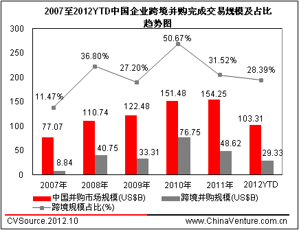 图1 2007年至2012YTD中国企业出境并购规模及占比趋势图