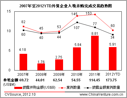 图6 2007年至2012YTD外资企业入境并购完成交易趋势图