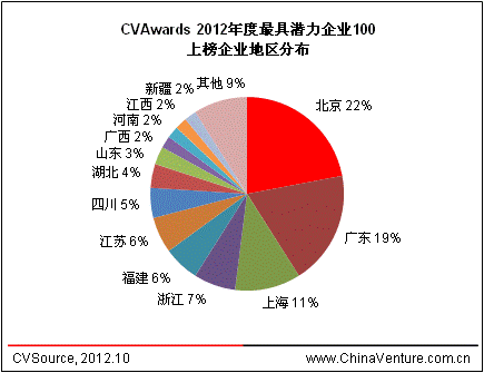 图1 CVAwards 2012年度最具潜力企业100上榜企业地区分布