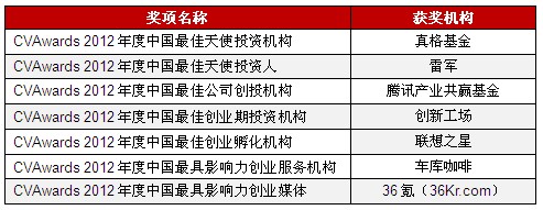 基于对中早期投资及企业价值挖掘的关注,ChinaVenture投中集团对早期投资参与机构及创业服务机构进行了梳理,并根据机构活跃度、行业影响力、投资(服务)规模等因素进行了评比,并得出CVAwards 2012年度中国最佳天使投资机构、最佳天使投资人、最佳公司创投机构、最佳创业期投资机构、最佳创业孵化机构、最具影响力创业服务机构、最具影响力创业媒体等奖项(见附表2)。