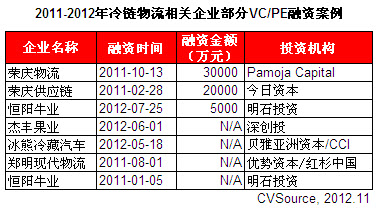 表1 2011-2012年冷链物流相关企业部分VC/PE融资案例