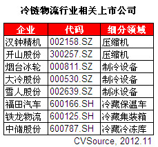 根据《农产品冷链物流发展规划》显示,通过改造、扩建和新建,到2015年我国增加冷库库容1000万吨;鼓励大型冷链物流企业购置冷藏运输车辆,争取全社会新增冷藏运输车4万辆,大幅度提升冷链物流企业的冷链运输能力。ChinaVenture投中集团分析认为,随着我国经济的发展和人民生活质量的提高,市场对冷链物流越来越重视,从而将带动制冷设备需求的增加,制冷设备投资价值凸显。