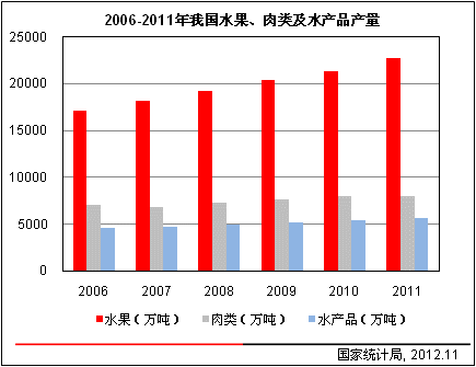 图2 2006-2011年我国水果、肉类及水产品产量