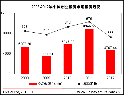 中国领先的金融信息资讯服务机构ChinaVenture投中集团最新数据显示,2012年中国创业投资市场披露案例566起、投资总额47.67亿美元,相比2011年全年分别下降42.0%和46.7%。2012年以来中国VC/PE市场明显降温,投资数量及投资金额持续处于较低水平。考虑到目前宏观经济及资本市场呈现回暖迹象,加上2012年市场“寒冬”中企业估值理性回归,预计未来一年中国VC/PE投资活跃度将有所增长,投资规模出现反弹。