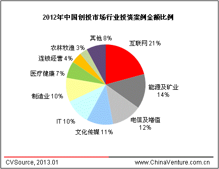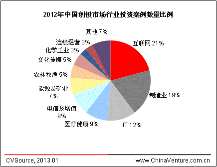 从2012年VC投资的行业分布来看,互联网依然是投资最活跃的行业,披露案例118起,占比20.8%,其次分别是制造业和IT行业,分别披露案例107和66起,占比18.9%和11.7%。此外,医疗健康及电信增值(移动互联网)行业也表现活跃,均披露案例50起以上。