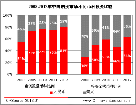 2012年人民币投资占比有所增长,主要原因在于随着Pre-IPO投资吸引力逐渐下降,越来越多本土人民币基金开始探索早期创业投资,如同创伟业、深创投、达晨创投、创东方等典型本土人民币基金管理机构均开始成立早期投资基金。而在此前人民币基金较少涉及的互联网、移动互联网领域,也开始出现更多的人民币投资案例。此外,过去两年间中国企业赴美上市渠道收窄,也一定程度上促进了人民币基金投资机会的增长。