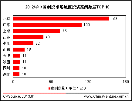 图6 2012年中国创投市场地区投资案例数量TOP 10