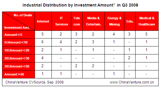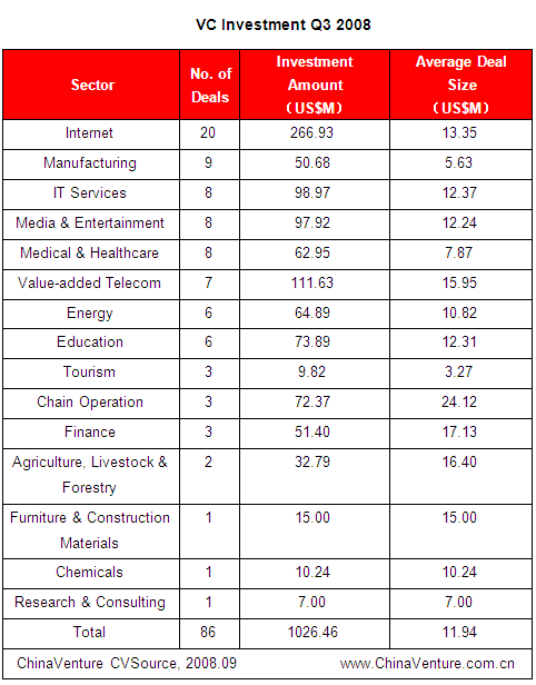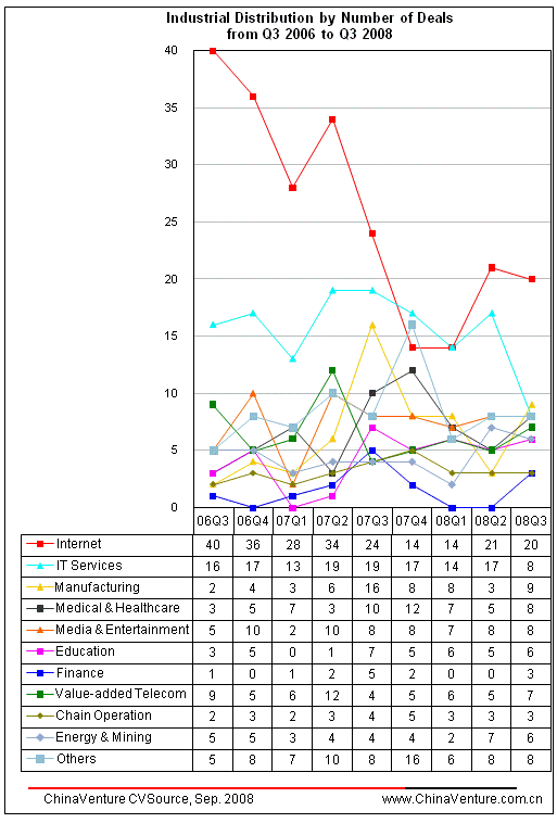 86 deals were secured in 15 sectors in Q3 2008. Internet, IT Services, Medical and Healthcare sectors formed the key investment sectors.