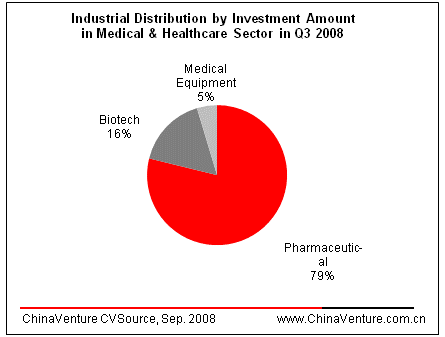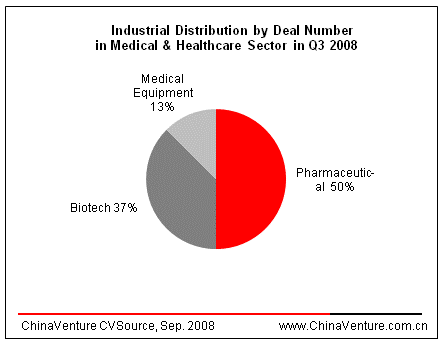 Pharmaceutical became the hotspot in the Medical and Healthcare sector in Q3 2008. Out of the 8 Medical and Healthcare deals, 4 Pharmaceutical deals secured US$49.63 Million, representing 50.0% of the total number of deals and 78.8% of the total investment amount (Figure2.3.2-2).